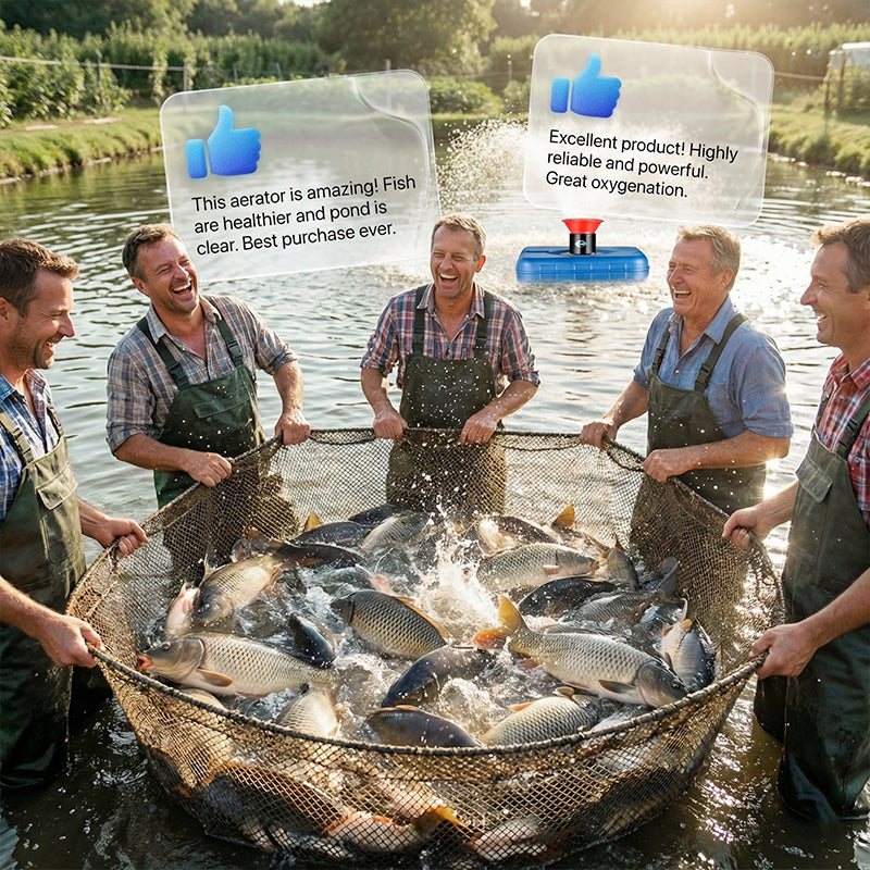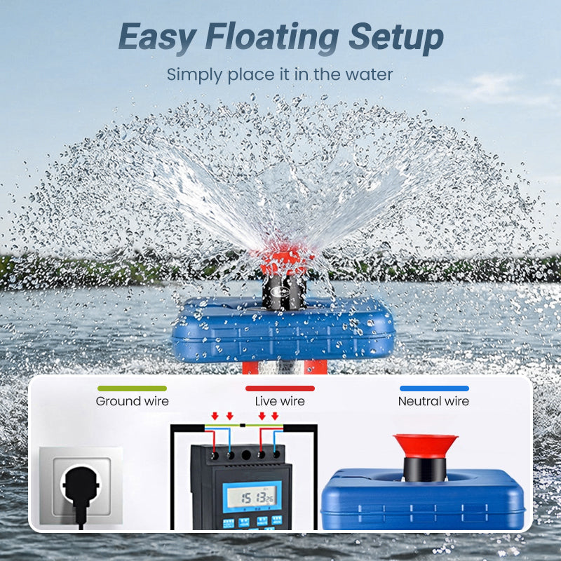 SCHWIMMENDE INSTALLATION – Mit einer robusten schwimmenden Basis für eine einfache Installation ausgestattet. Dank dieser Konstruktion kann der Belüfter direkt im Wasser platziert werden, passt sich automatisch an Wasserstandsschwankungen an und vereinfacht die Installation.