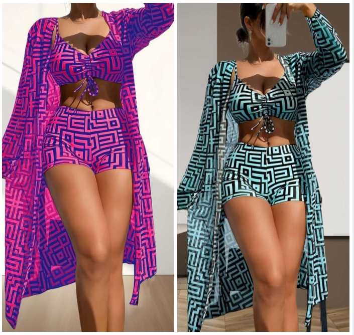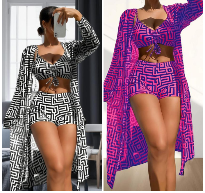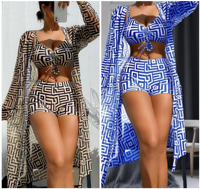 Peppen Sie Ihre Bademodenkollektion mit diesem trendigen 3-teiligen Badeanzug-Set auf. Dieses Set für modebewusste Frauen besteht aus einem schmeichelhaften Bikinioberteil mit Rüschen, einer Badeshorts mit hoher Taille und einem leichten, durchsichtigen Überwurf - perfekt, um am Strand oder am Pool ein gewagtes Statement abzugeben.🌊 3-teiliger Badeanzug für einen vielseitigen Look