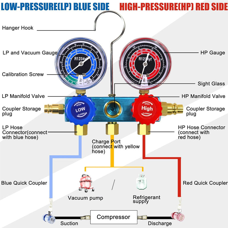 PROFESSIONELLES KLIMAANLAGEN-MESSGERÄT: Diagnose-Manifold-Messgerät für Kältemittel R1234yf. Ideal für die Befüllung, Evakuierung/Vakuum, Diagnose und Rückgewinnung von Kältemitteln in Fahrzeugen oder Haushaltsklimaanlagen. Perfektes Werkzeug für die Heimwerkstatt oder Kfz-Werkstatt. Ein tolles Weihnachtsgeschenk.