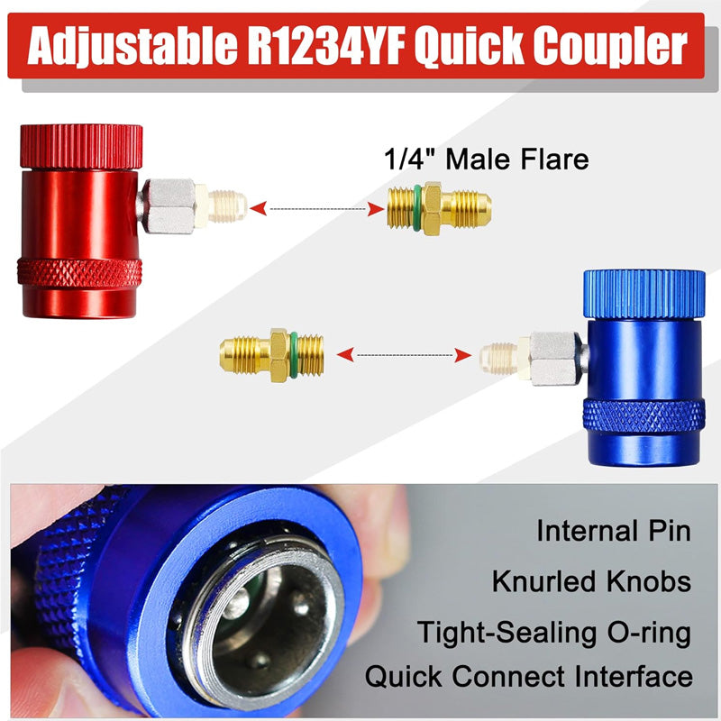 VERSTELLBARE SCHNELLKUPPLUNGEN & VENTILEINSATZ-ENTFERNER: Die R134-Schnellkupplungen aus Messing sind robust und zuverlässig. Mit präziser Rastverriegelung und rutschfestem Riffelring für einfaches An- und Abkuppeln – kompatibel mit allen Serviceanschlüssen. Rot für Hochdruck, Blau für Niederdruck. Inkl. 1x Ventileinsatz-Entferner (Doppelkopf) für die Wartung von Auto-Klimaanlagen.