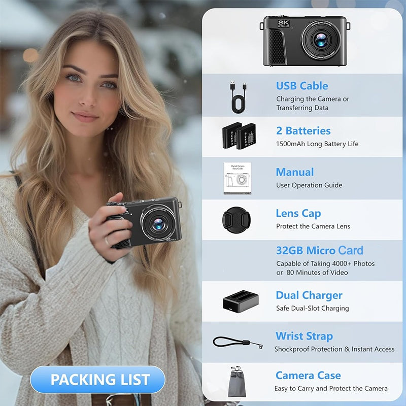 8K-Digitalkamera mit 88-Megapixel-Sensor und 3-Zoll-Flip-Screen mit 180-Grad-Schwenkbereich