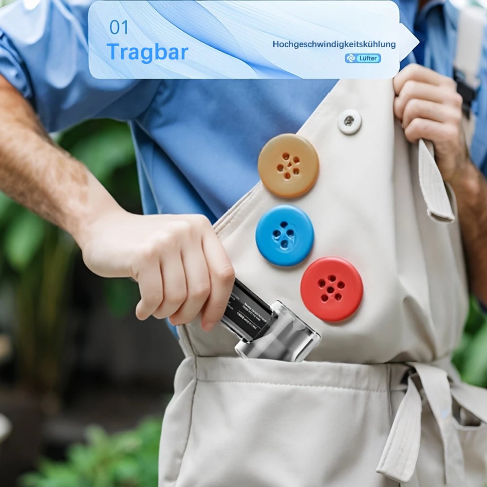 ❄️ TRANSPARENTER MECHA-STIL & HIGH-TECH: Gönnen Sie sich die perfekte Verbindung aus futuristischem Design und revolutionärer Kühltechnologie mit unserem eleganten Taschenventilator. Das transparente Gehäuse im Mecha-Stil offenbart eine ausgeklügelte Technik, während das HD-Digitaldisplay die Windgeschwindigkeit, den Akkustand und den Kühlmodus anzeigt.
