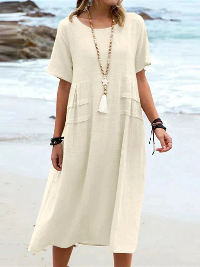 💕Damen Rundhalsausschnitt Baumwolle Leinen Midikleid
