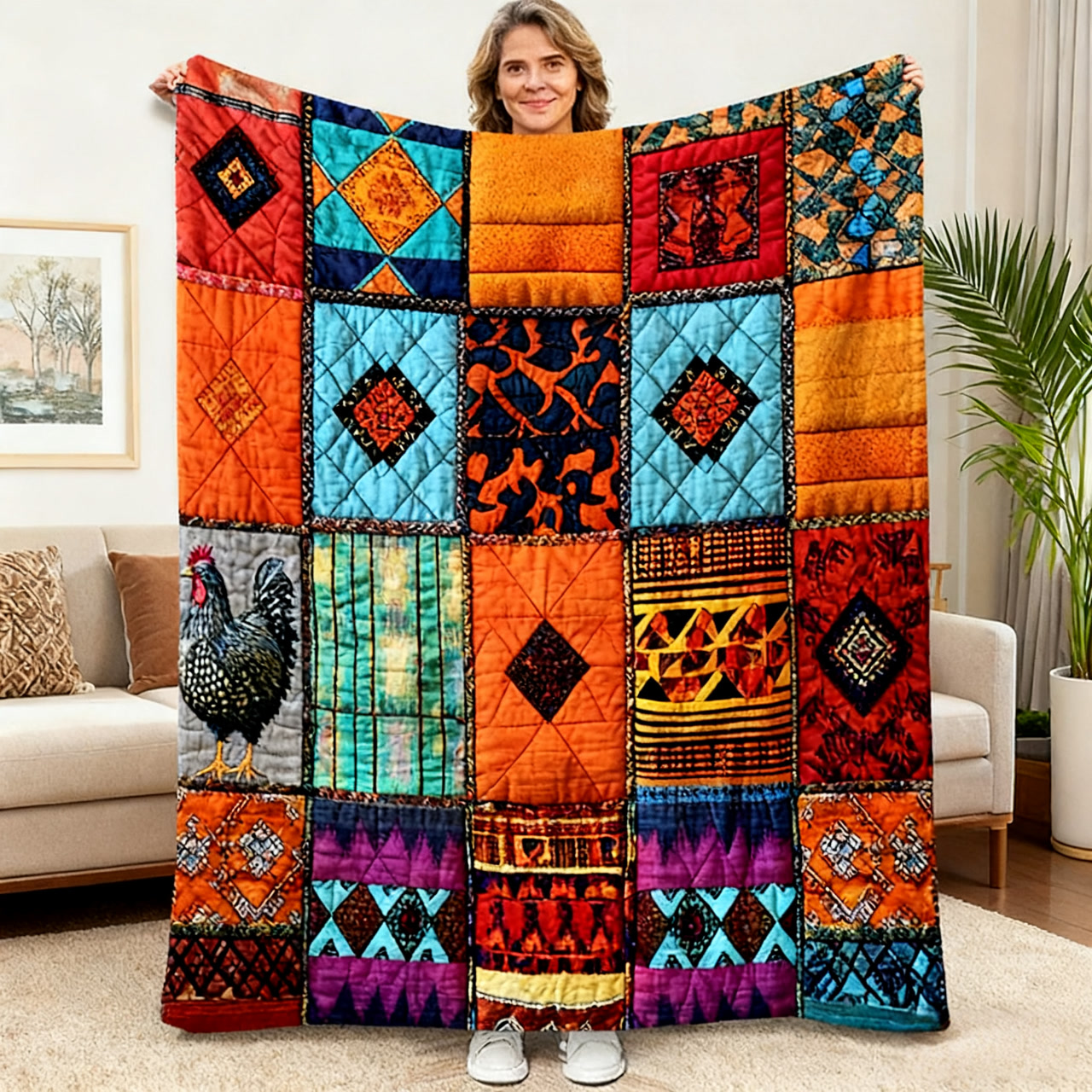 Diese kuschelige Fleecedecke hat ein süßes Hühner-Patchwork-Design, das jeden Raum sofort aufhellt.