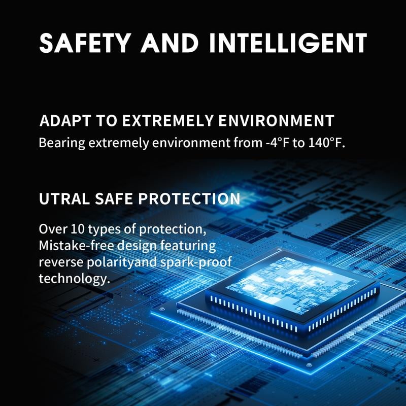 【10 intelligente Sicherheitsfunktionen und stabiler Betrieb】 : Unser Auto-Starthilfegerät verfügt über 10 Schutzsysteme (Verpolung, Rückladung, Tiefentladung, Rückwärtsanschluss, Kurzschluss, Überladung, Überstrom, Überhitzung, Funkenschutz). Das Hochleistungs-Starthilfegerät für die Autobatterie gewährleistet Ihre Sicherheit während des Gebrauchs und funktioniert bei Temperaturen von -30 °C bis 60 °C, selbst bei extremen Wetterbedingungen.