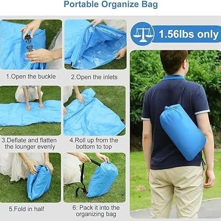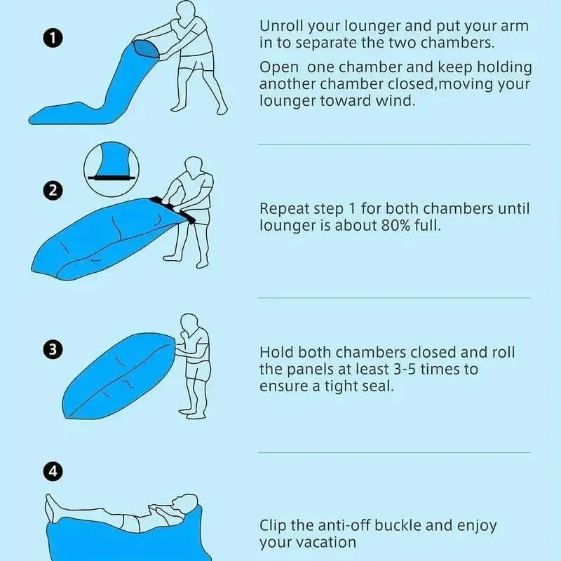 - Kein Aufpumpen und keine Ausrüstung erforderlich! Mit unserem innovativen Ein-Mund-Design können Sie mühelos beide Luftkammern gleichzeitig aufblasen. Eine leichte Brise oder etwas Bewegungsfreiheit genügen, um Ihre Liege aufzustellen und einen unvergleichlichen Komfort zu genießen.