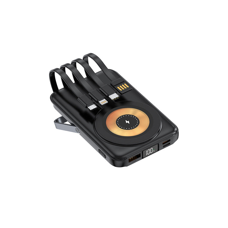 EINGEBAUTES MULTI-KABEL-SYSTEM – Diese Powerbank ist mit vier integrierten Anschlüssen ausgestattet: Lightning, Typ-C, Micro USB und USB-A. Sie ermöglicht das gleichzeitige Aufladen mehrerer Geräte, ohne dass zusätzliche Kabel benötigt werden. Egal, ob Sie mit leichtem Gepäck reisen oder mehrere Geräte unterwegs verwalten, dieses All-in-One-Design spart Platz und reduziert das Durcheinander. Nehmen Sie einfach ein Gerät, und Sie sind für jede Ladesituation gerüstet.