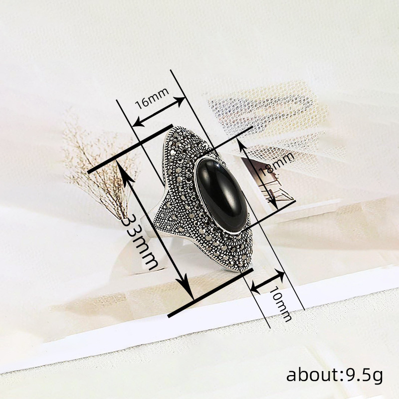 AuffĂ€lliges ovales MittelstĂŒck â Der groĂe, polierte schwarze Stein bildet einen markanten Blickfang und zieht durch seine geheimnisvolle Tiefe alle Blicke auf sich. Dieses Statement-Element strahlt Selbstbewusstsein aus und verleiht deinem Stil eine subtile, gotische Romantik.