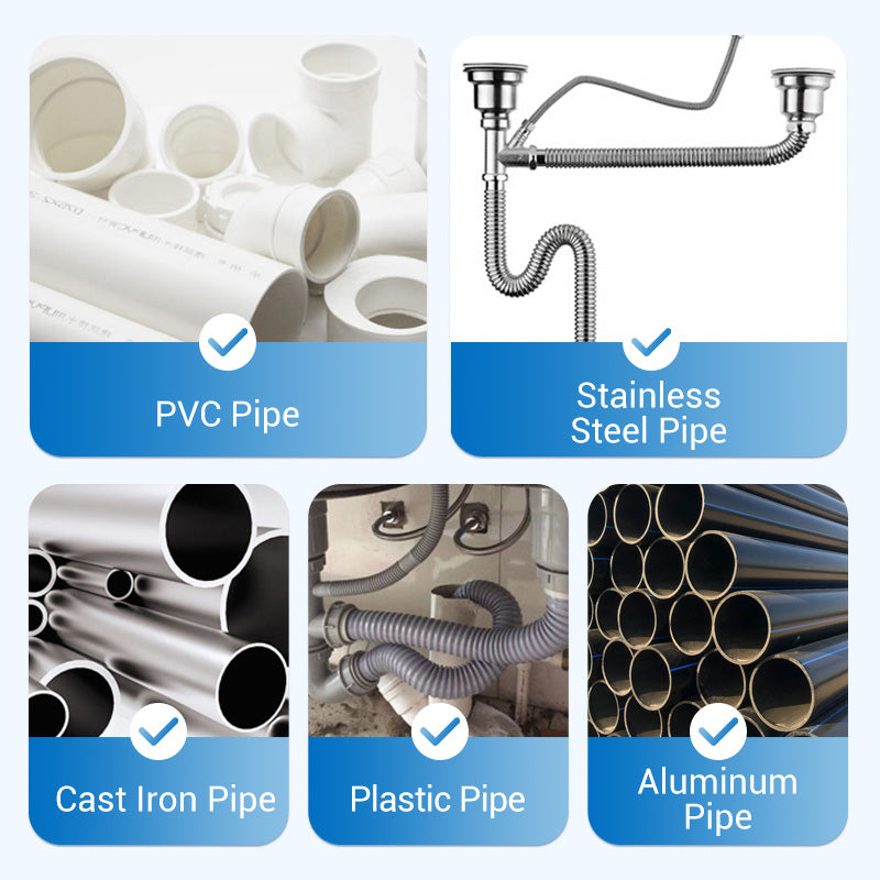 SICHER UND WIRKSAM FÜR ALLE ROHRTYPEN: Dieses leistungsstarke Baggerhilfsmittel reinigt PVC-, Keramik-, Kunststoff-, PE-, Gusseisen- und Edelstahlrohre effektiv und ohne Schäden zu verursachen, da es keine aggressiven, korrosiven Chemikalien enthält.