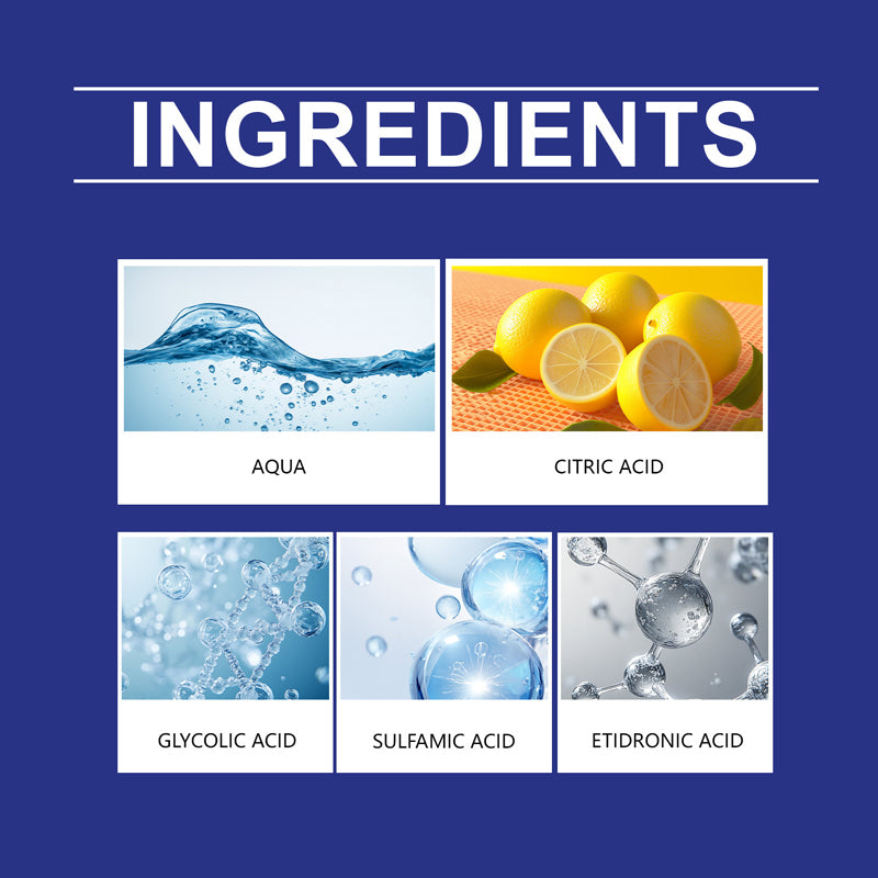 Hauptbestandteile: Wasser, Zitronensäure, Amidosulfonsäure, Glykolsäure, Hydroxyethylidendiphosphonsäure
