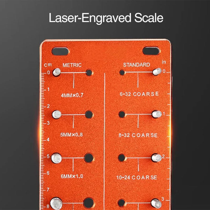 MULTIFUNKTIONALES DESIGN - Mit eingebautem Lineal von 6 Zoll und 14 Zentimetern auf beiden Seiten hilft der Gewinde-Prüfer für Muttern und Schrauben, verschiedene Längen von Schrauben, Bolzen und Muttern schnell zu identifizieren.