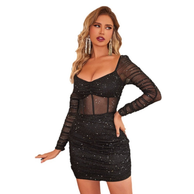 Paket beinhaltet:1 * Damen Sexy Mesh Glitter Langarm Mini Kleid